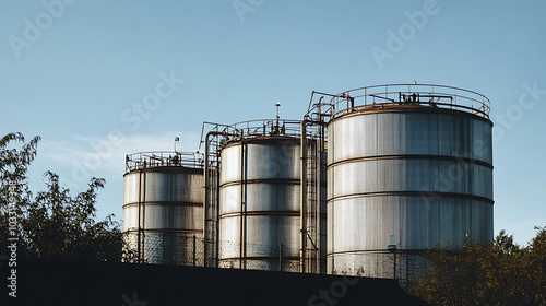Large tanks and sprawling pipelines at gas processing facility under clear blue sky create industrial landscape. scene evokes sense of scale and functionality