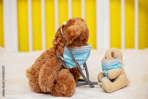 large teddy bear with phonendoscope in protective mask and small teddy bear in medical mask sit in cot. Coronovirus, quarantine, pandemic, flu, cold,illness. Medicine concept and health