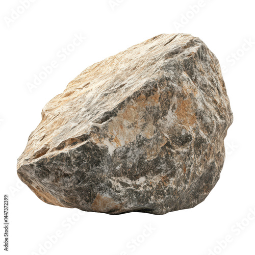 Large textured rock situated on a plain surface with irregular shape and natural color variations displayed in daylight