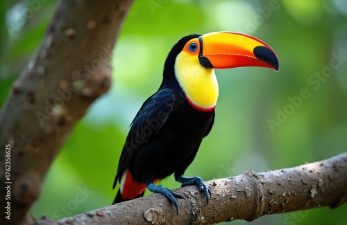 Large toco toucan with bright yellow chest and big orange beak sits on tree branch in green jungle. Wild bird with blue feet and black feathers has red tail. Natural habitat.