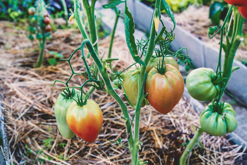 Large tomatoes in the shape of a heart on beds in a polycarbonate greenhouse. Small subsistence farming