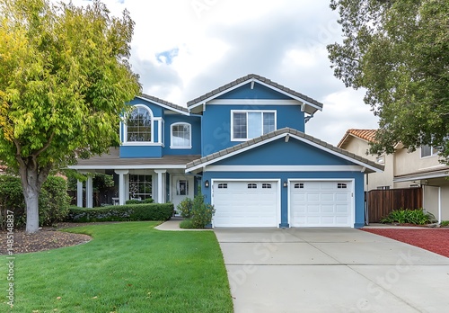 Large twostory blue house with a green lawn and driveway, gray tile roof