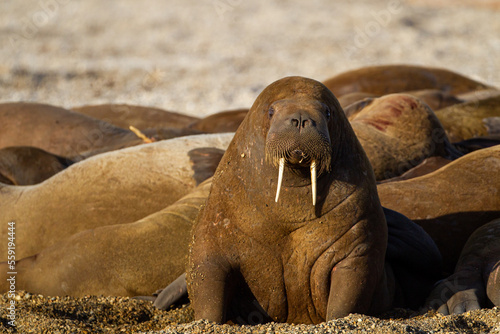 Large walrus lying on the beach at the waters edge in the Arctic sun