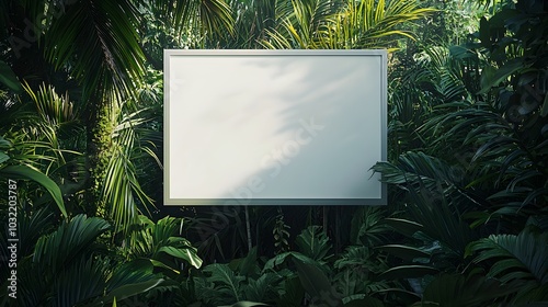 Large White Billboard Framed by Lush Green Tropical Foliage,Perfect for Branding Mockups and Clean