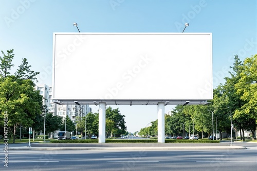 Large white billboard on city street with modern buildings and green trees in daylight, clean background for creative advertisement. Ai generative