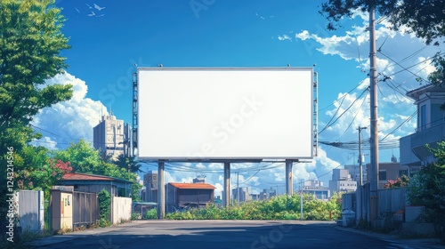 Large White Billboard Surrounded by Urban Landscape with Clear Blue Sky, Ideal for Marketing Campaigns and Advertisements