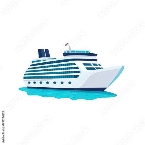 Large white cruise ship sails on calm blue waters, showcasing its multiple decks and windows. ship sleek design and towering structure evoke sense of adventure and luxury travel