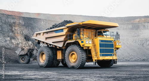 Large yellow dump truck filled with coal on mining site, excavator in background
