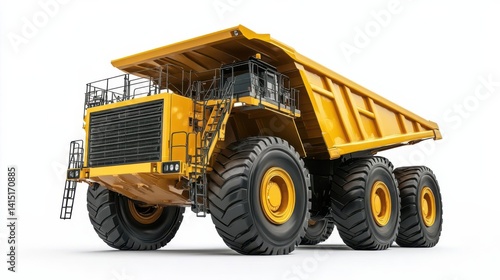 Large yellow dump truck on a white background, showcasing its massive tires and structure, ideal for industrial use