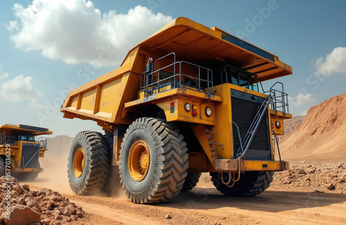 Large yellow dump truck with black tires on dirt road. Blue trailer and rugged mountainous landscape in background under clear blue sky. Heavy industrial machine for excavation and ore transportation.