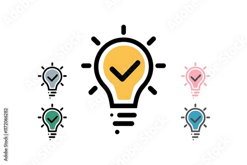 Large Yellow Light Bulb Icon with Small Colorful Bulbs Around on a White Background