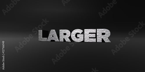 LARGER - hammered metal finish text on black studio - 3D rendered royalty free stock photo. This image can be used for an online website banner ad or a print postcard.