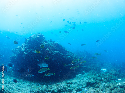 美しいメジナ(イスズミ科)、ホウライヒメジ(ヒメジ科)、チョウチョウウオ(チョウチョウウオ科)他の群れ。 英名学名:Largescale Blackfish (Girella punctata), Whitesaddle goatfish (Parupeneus ciliatus), Oriental ButterflyFish (Chaetodon aurites) 中木ヒリゾ浜2024年