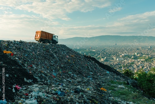 Large-scale hill of waste looms over urban landscape as a garbage truck works amidst the environmental pollution in evening light