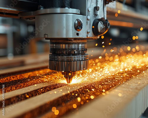 Laser cutting machine producing bright sparks while cutting metal sheet in industrial workshop