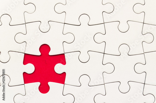 last piece missing, still life with a white jigsaw/puzzle incomplete over a red background, symbol of problem solving