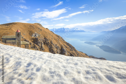 Last snow at San Bernardo Church, Monte Bregagno, Dongo, Como Lake, Lombardy, Italy, Europe.
