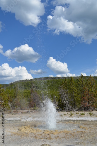 Late Spring in Yellowstone National Park: Vixen Geyser Spouts into the Blue Sky in the Back Basin Area of Norris Geyser Basin