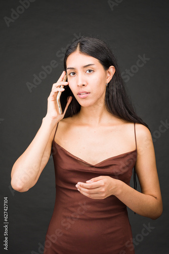 Latin american woman call frustrated trouble with anxiety on cellphone problem. black background