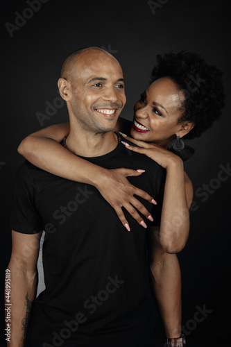 latin girl with afro hugging bald latin guy from behind. Couple on black background