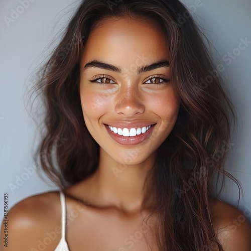Latin woman with bright smile against gray wall.
