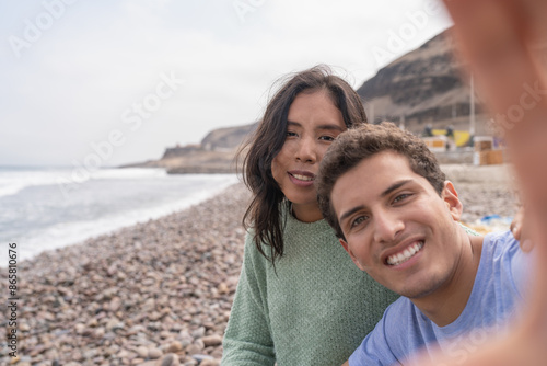 Latin young couple taking a selfie sitting on a beach
