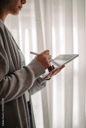 Latina woman using a tablet and stylus, surrounded by soft, natural lighting and sheer curtains.