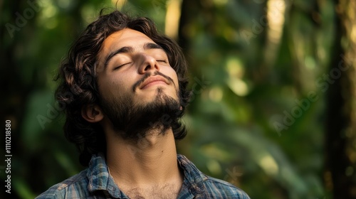 Latino biologist with eyes closed, listening to nature and enjoying the air on his face, standing in the open field in the middle of the jungle