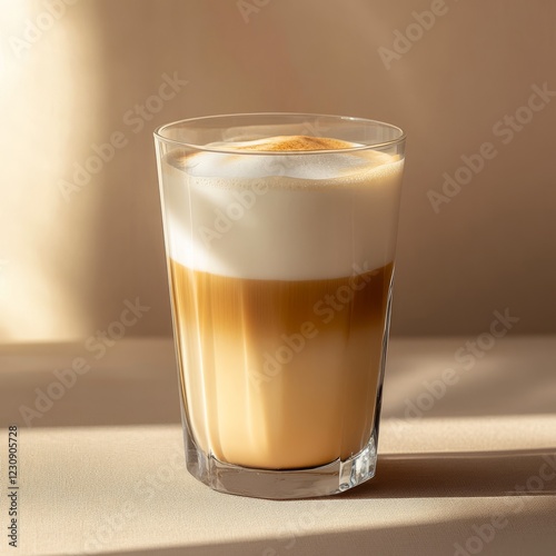 Latte Macchiato in a glass on a beige background in sunlight.