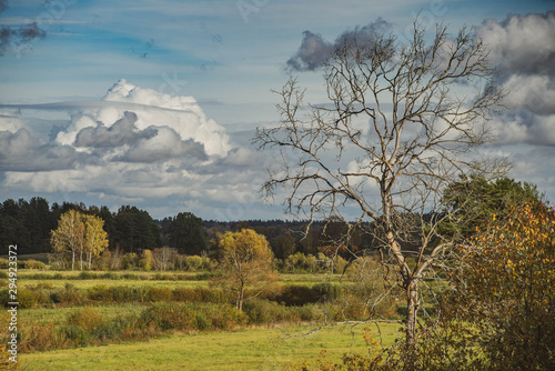 Latvian autumn nature. Forest and cloudy sky. Dead tree.