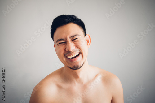 Laugh face of Asian man in topless portrait isolated on gray background.