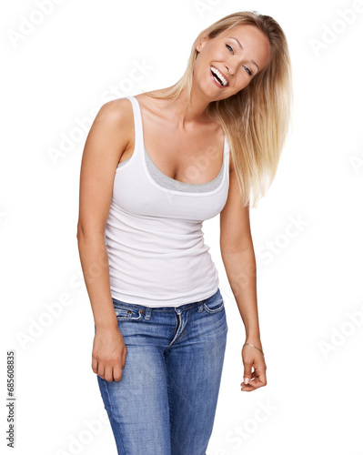 Laugh, studio portrait and woman with fashion, casual style and relax in trendy jeans and clothes. Smile, funny joke and fashionable female model isolated on white background in tank top with humor