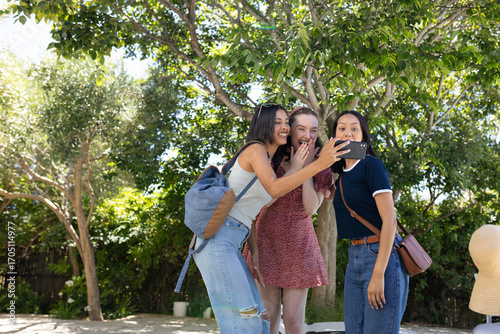 Laughing and posing for selfie, three young women enjoy sunny day outdoors