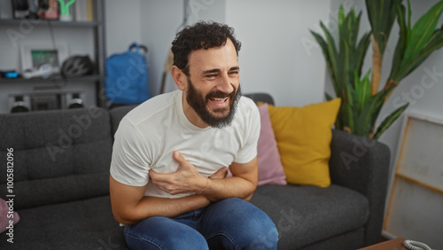 Laughing bearded man sitting comfortably in a modern living room with colorful cushions.