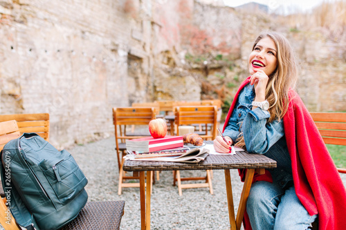 Laughing beautiful young woman writing poetry in the huge backyard during morning time. Cheerful girl with a red cape sits at a coffee table thinking about something funny. Happiness, morning leisure
