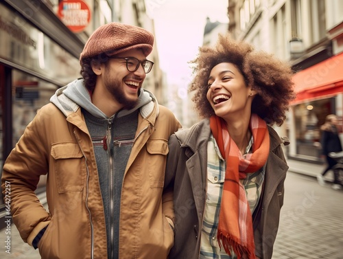 laughing couple walking happily on the street in the city