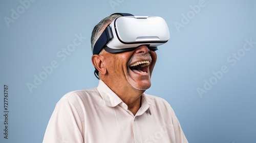Laughing Senior Man Using Virtual Reality in Minimalistic Cinematic Setting Generative AI