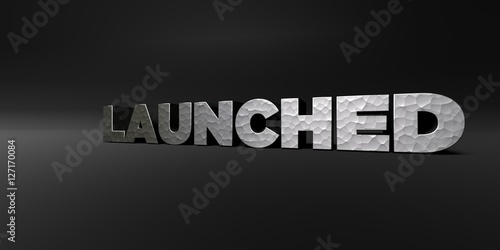 LAUNCHED - hammered metal finish text on black studio - 3D rendered royalty free stock photo. This image can be used for an online website banner ad or a print postcard.