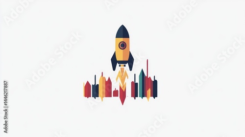 Launching Rocket Over Abstract Cityscape Symbolizing Innovation Progress and Urban Developme