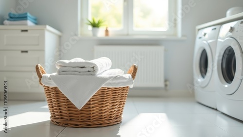 Laundry basket with towels in a clean laundry room.
