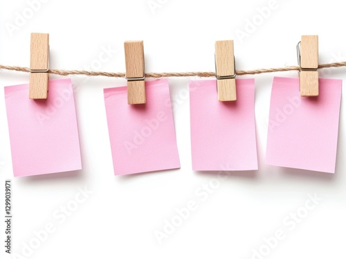 Laundry Clip Art Stock Photo: Pink Paper, Clothes Pins, Brown Rope, White Background