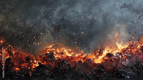 Lava erupts from a volcanic surface, glowing with bright orange and red hues against a dark, smoky backdrop, creating a dramatic and captivating scene of nature's power