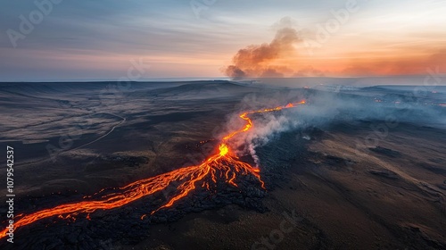 Lava flow during sunset with smoke rising in a dramatic volcanic landscape.