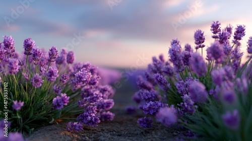 Lavender fields at sunset with vibrant purple blooms and cloudy sky