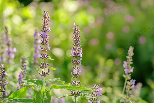 Lavender flowers in the sun, with a blurred background and copy space on one side.