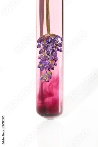 Lavender natural extract.Aroma of lavender. Lavender flower in a transparent laboratory flask with lilac paint close-up isolated on white background. Organic Pharmacy. organic beauty