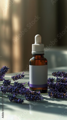 Lavender Oil Dropper Bottle Beside Fresh Lavender Flowers in Soft Light