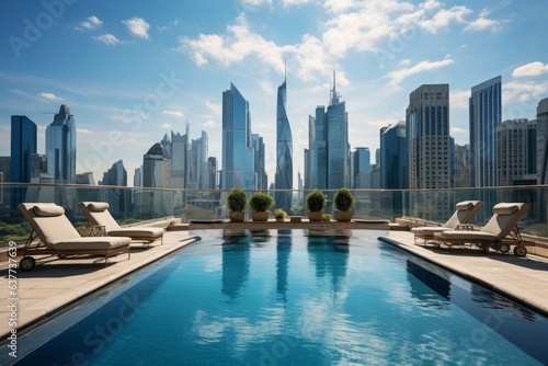 Lavish Rooftop Pool With Stylish Lounge Area, Generative AI