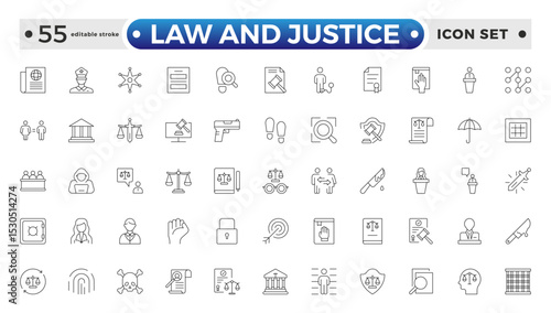 Law and Justice outline icon set. Court icon set. Containing Investigation, law, judgment, criminal, justice law, court legal, lawyer, criminal, prison and more. Editable stroke outline icon.