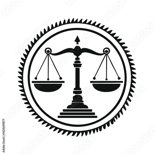 Law and justice symbol with balanced scales in a circular emblem black vector icon